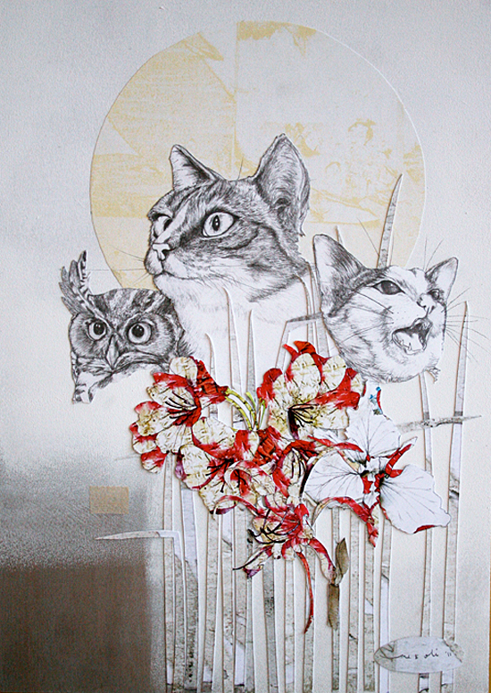 The piece below (not part of the fabric collection) was created in memory of their cat. I love how they describe it: “a mixed media piece combining tender pencil lines & a fruity burst of collage.”