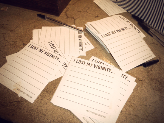 The “I lost my virginity” forms, once filled in by the public, are going to contribute to an upcoming exhibition by Skullboy. It was great to hear about his creative process and the thought behind his work. Very inspiring, real, cool stuff.